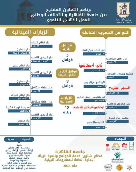 بالتعاون مع التحالف الوطني للعمل الأهلي التنموي: جامعة القاهرة تطلق برنامج القوافل التنموية الشاملة لعام 2026 بمشاركة موسعة من كلياتها