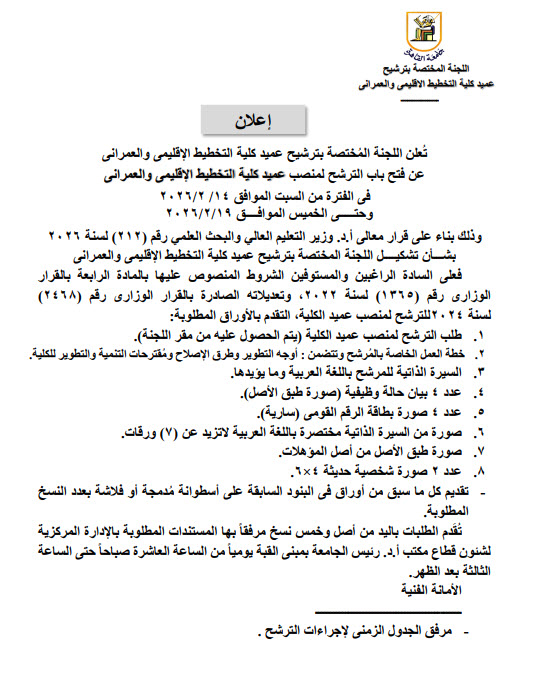 كلية التخطيط العمراني وفيما يلي صورة ضوئية من الاعلان