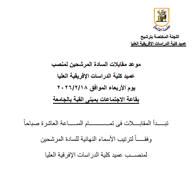 جامعة القاهرة تعلن عن جدول المقابلات للسادة المتقدمين لمنصب عميد كلية الدراسات اإلفريقية العليا